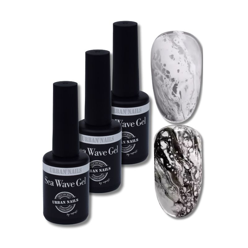 De Urban Nails Sea Wave Gel Kit voor unieke marmer- en oceaanlooks. Een set met Clear, White en Black. De gel loopt mooi uit en creëert vanzelf diepte.